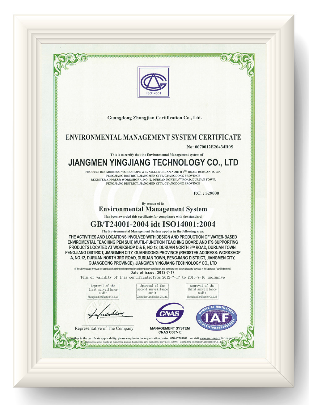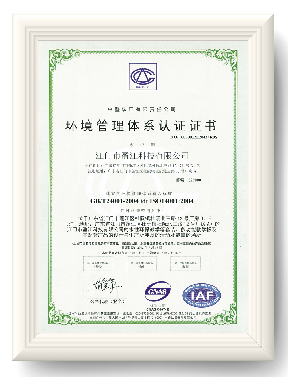 環(huán)境管理體系認(rèn)證證書ISO 14001:2004(英文版)