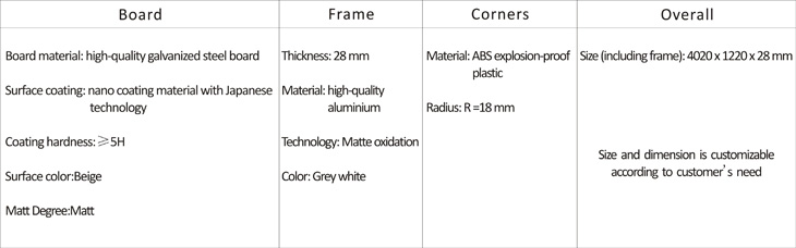 It is a galvanized steel board that is thick, solid and durable. It is coated with crystal lattice nonmaterial developed by our company with Japanese technology. No reflection when viewing from an angle greater than 30 degree.