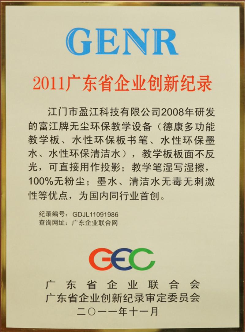 江門市盈江科技有限公司榮獲2011廣東省企業(yè)創(chuàng)新紀(jì)錄獎牌。公司研發(fā)的富江牌無塵環(huán)保教學(xué)設(shè)備(德康多功能教學(xué)板、水性環(huán)保板書筆、水性環(huán)保墨水、水性環(huán)保清潔水),教學(xué)板板面不反光,可直接用作投影;教學(xué)筆濕寫濕擦,100%無粉塵;墨水、清潔水無毒無刺激性等優(yōu)點,為國內(nèi)同行業(yè)首創(chuàng)。