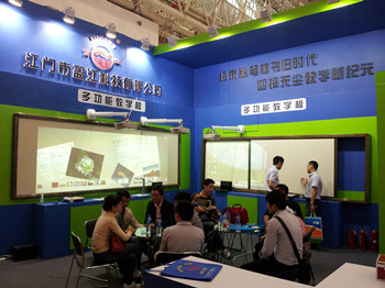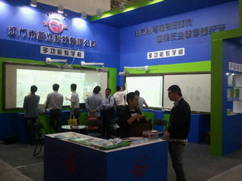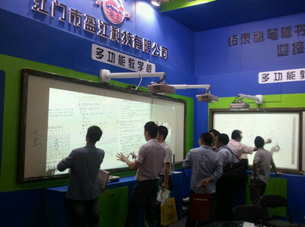 江門市盈江科技有限公司作為中國教育裝備行業(yè)協(xié)會會員、廣東省教育裝備行業(yè)協(xié)會會員之一,有幸參加該次盛會。在該次展會中,我司展示了一系列嶄新科技的教學產(chǎn)品——德康多功能教學板(手觸型)和德康互動短焦投影機雙屏投影。產(chǎn)品新穎、技術(shù)先進,自然吸引了眾多從事教育行業(yè)的領(lǐng)導與專家到我司展臺參觀,了解及咨詢相關(guān)產(chǎn)品的詳細資料。不少企業(yè)代表對我司富江牌德康系列教學產(chǎn)品深感興趣,有意與我司合作發(fā)展,在當?shù)亟?jīng)銷我司產(chǎn)品。